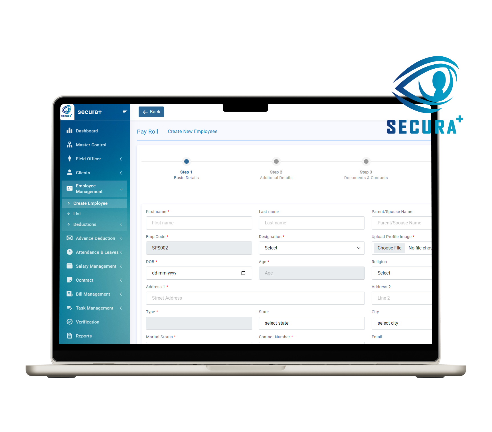 Track, update, and manage your workforce from one centralized dashboard. Secura+ empowers HR teams with a digital employee master that stores verified records, roles, status, and more.